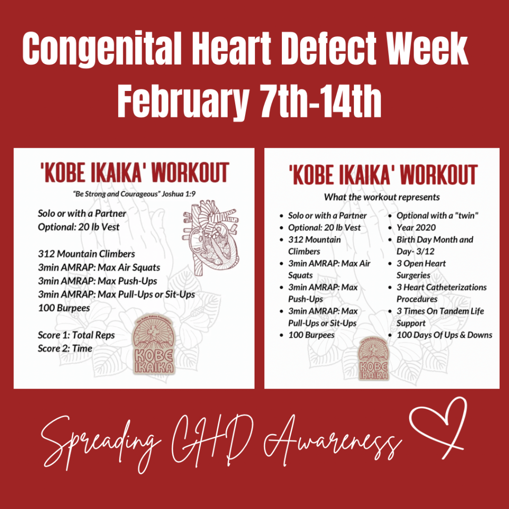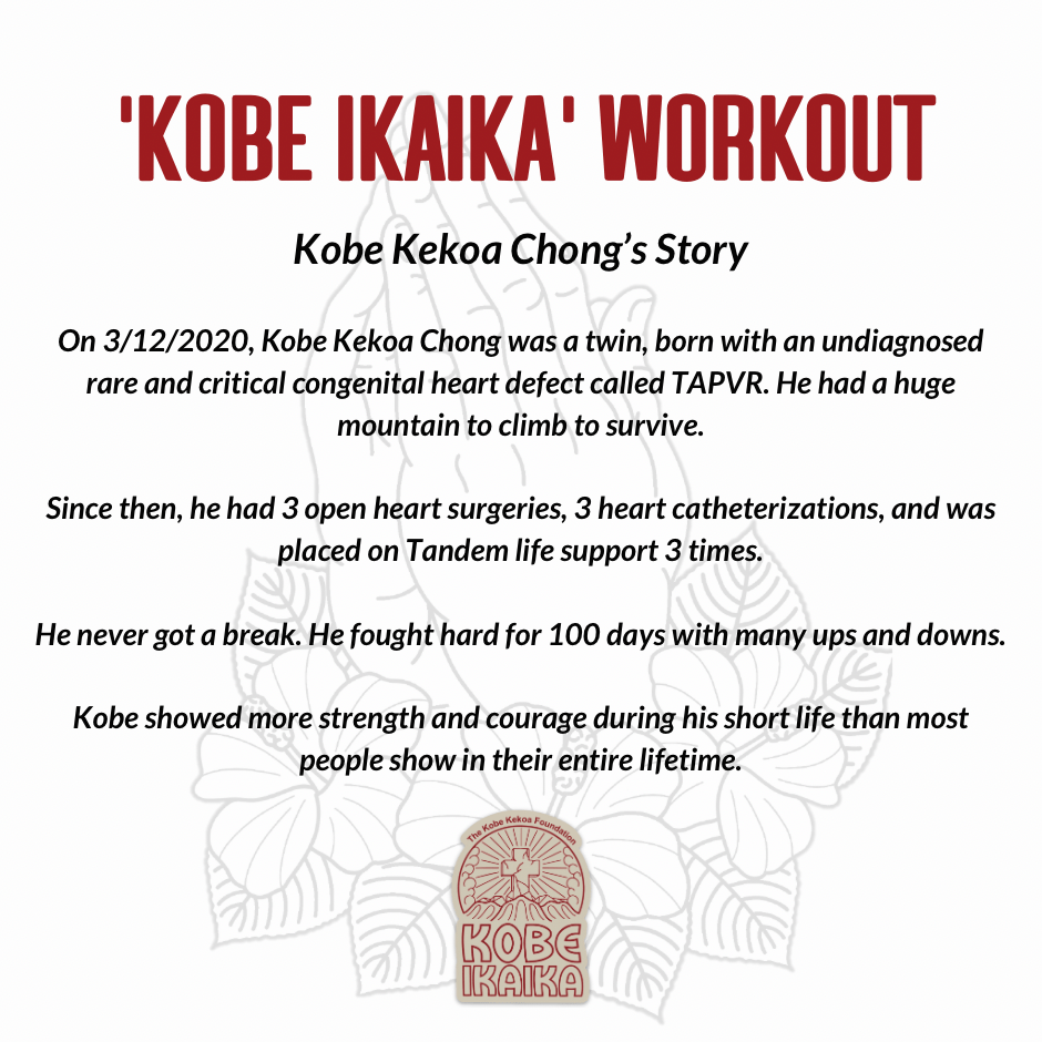The ‘Kobe Ikaika’ Workout honors Kobe’s life and other children with CHD, helps raise awareness, and supports our Mission.